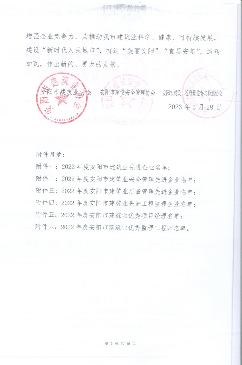 安陽市建筑業協會、安陽市建設安全管理協會、安陽市建設工程質量監督與檢測協會聯合公布“2022年度安陽市建筑業先進單位、優秀項目經理(建造師)”的通知,河南瑞恒建筑工程有限公司再次榮獲2022年度“安陽市建筑業先進企業”、“安陽市建筑業安全管理先進企業”、“度安陽市建筑業質量管理先進企業”和數名優秀項目經理,我司建造師馬艷紅、張富芹、魏艷玲、徐翊君、魏新、單意超、宋賓賓、朱志剛、華英麗、王雨等十人也榜上有名。